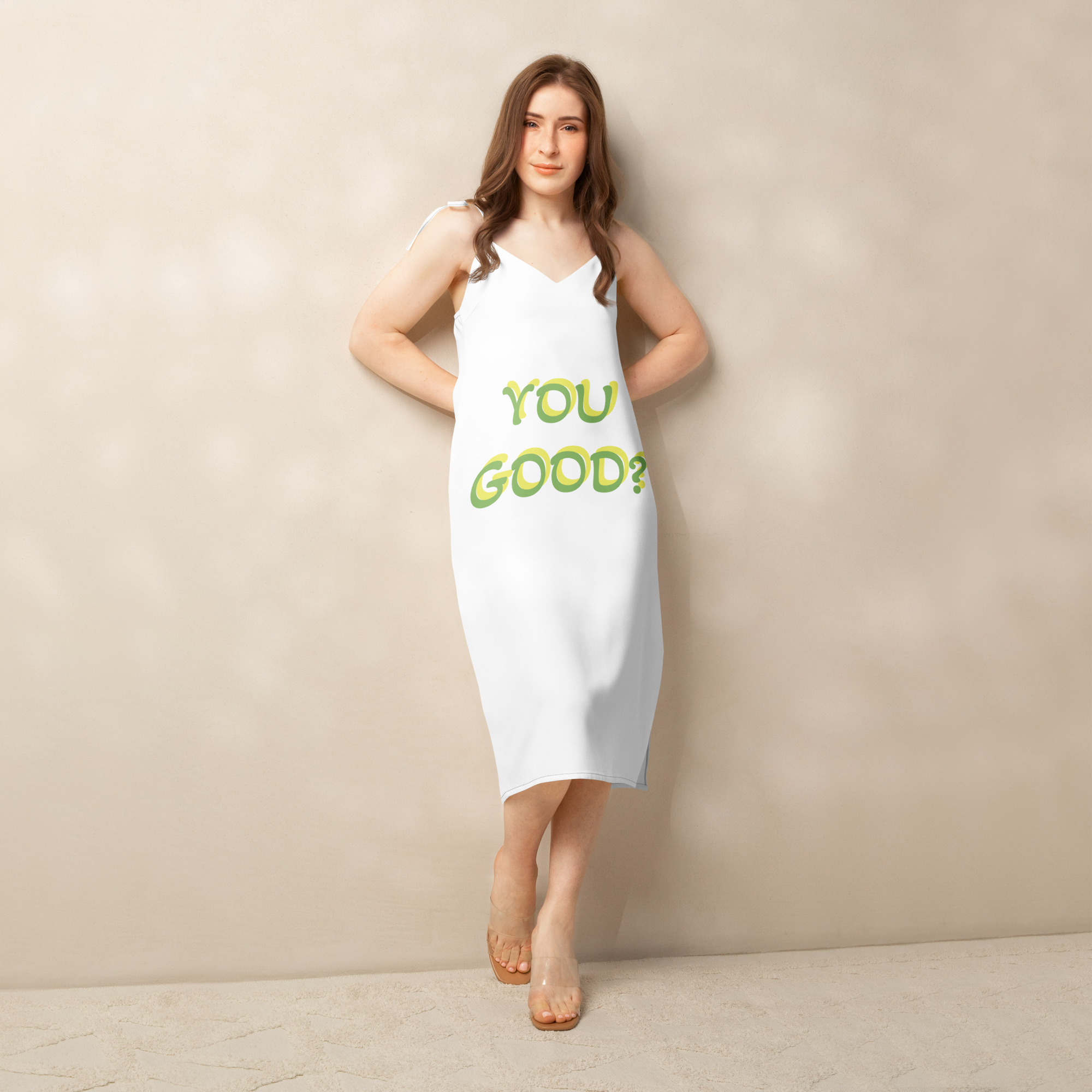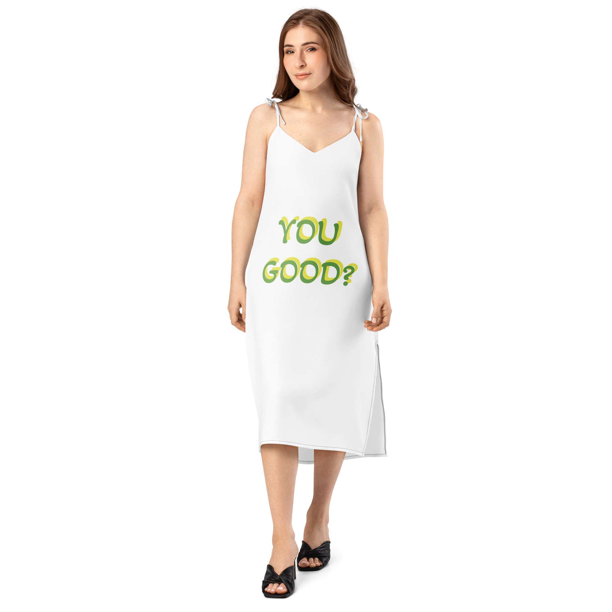 Floaty, flirty, and totally flattering—from daytime garden parties to dinner dates. This midi dress features a breezy side slit, adjustable tie straps, and a built-in bra for no-fuss style.